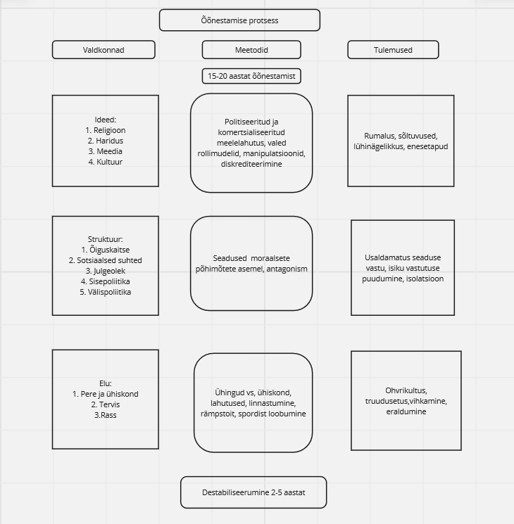 Õõnestamine koosneb põhimõtteliselt neljast staadiumist. Esimene staadium on protsess, mida nimetatakse demoraliseerimiseks. See räägib juba iseenda eest. Ühiskonna demoraliseerimine kestab 15 kuni 20 aastat. Miks just 15 kuni 20? See on piisav aeg ühe põlvkonna õpilaste või laste harimiseks. Selle aja sees kujunevad välja maailmavaade, isiksus, ideoloogia – mitte rohkem ega vähem.
